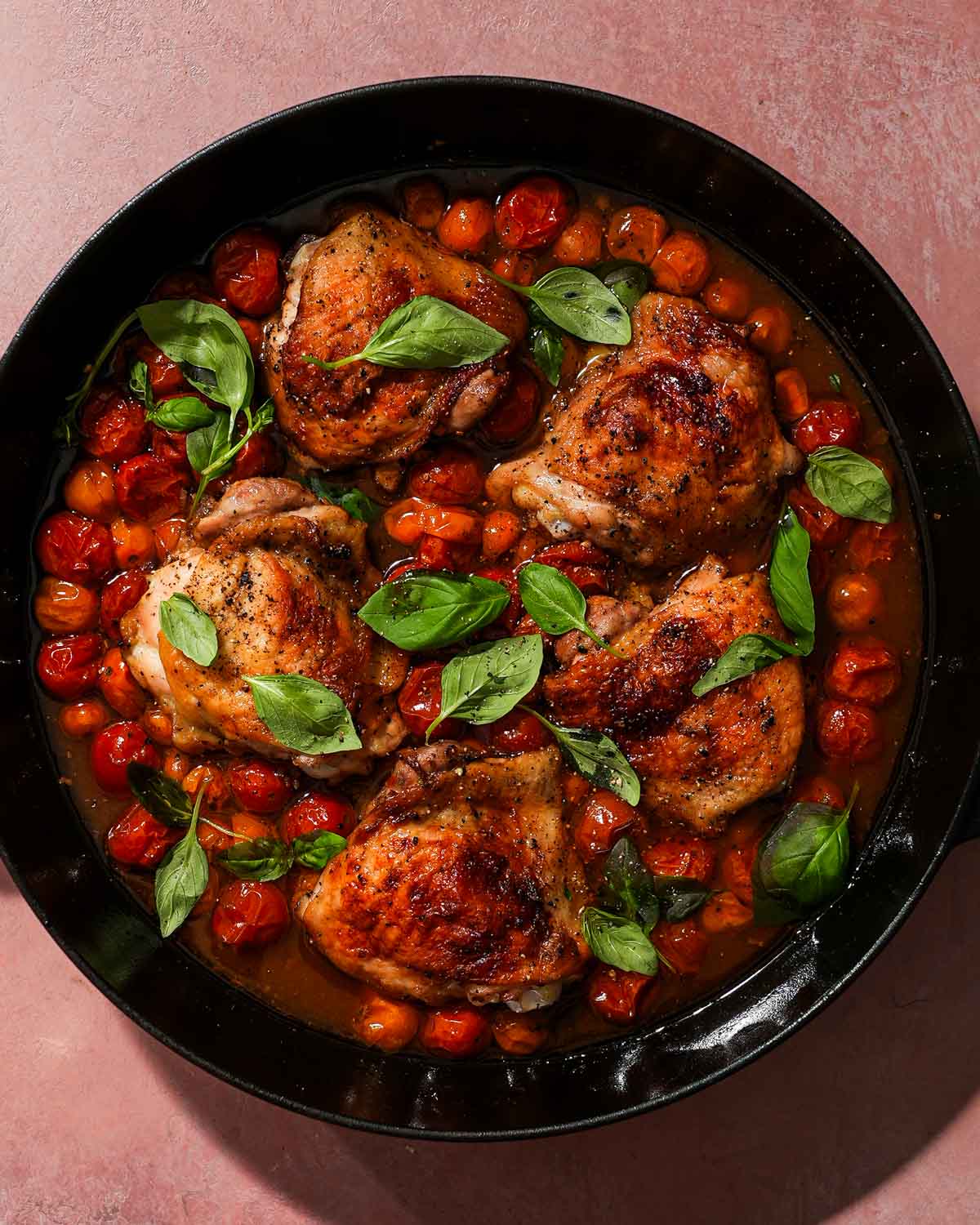 When summer tomatoes are here, we lean on this One Pan Balsamic Calabrian Chicken with Cherry Tomatoes. This recipe brings together chicken thighs roasted with cherry tomatoes in a balsamic calabrian chili sauce. All finished with fresh basil!