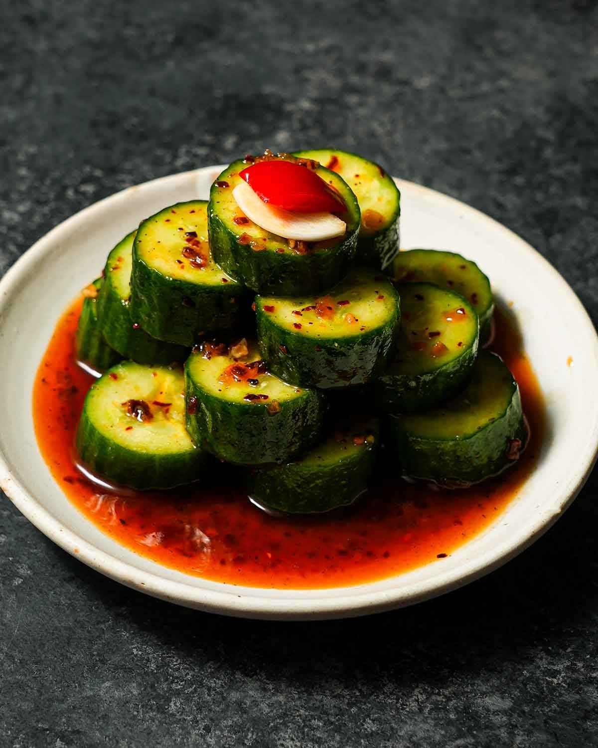 - Dressing: A mix of rice vinegar, toasted sesame oil, chili oil, and sugar is tossed together and over the cucumbers. It’s that simple!