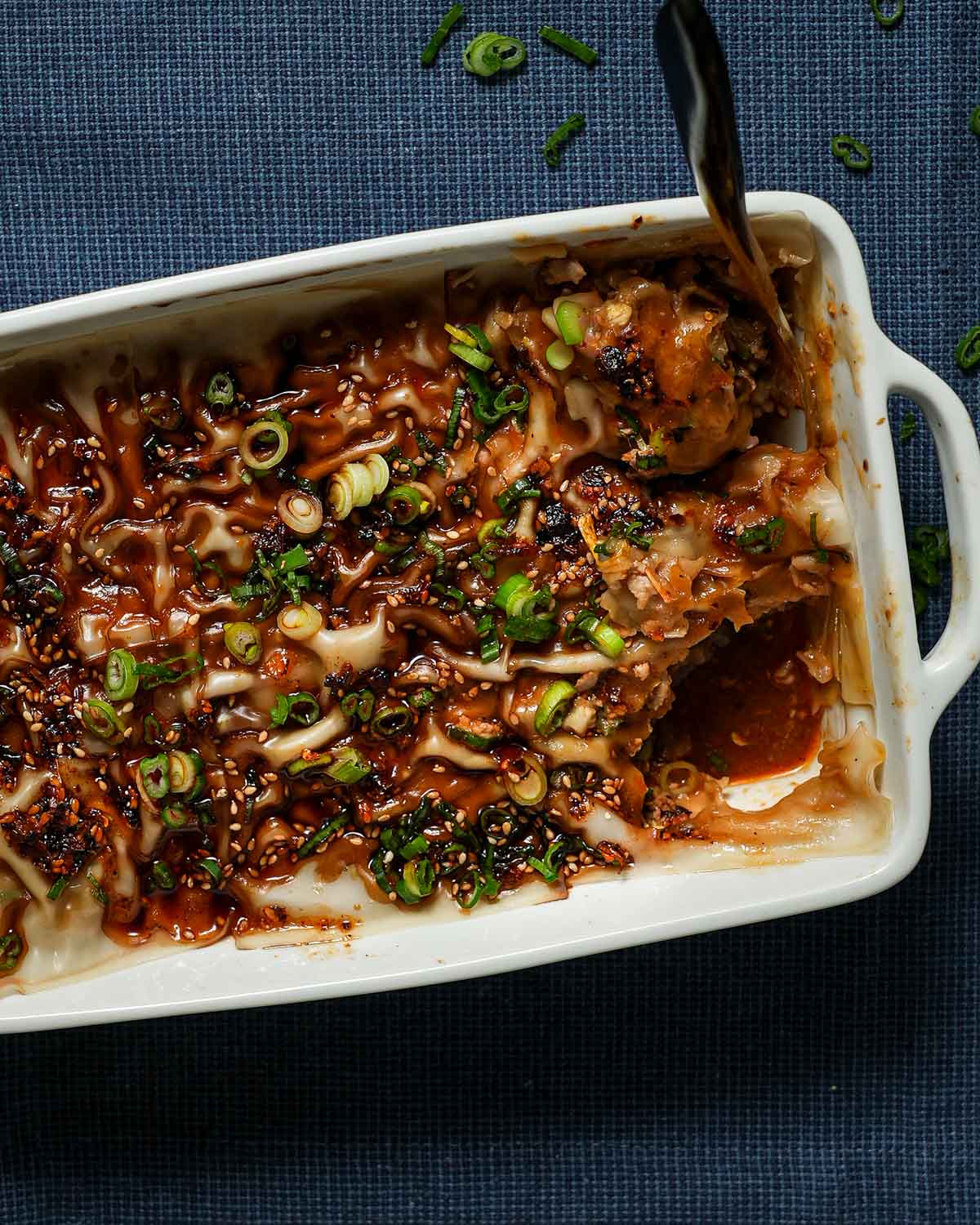 - For topping: To top the dumpling lasagna, we are using soy sauce, chili oil, more green onions, and toasted sesame seeds.